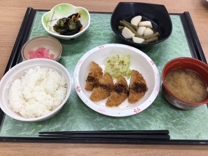 ヒレカツは誰でも噛み切れるような柔らかさで茹でたキャベツの胡麻和えが味を引き立たせてます![]()