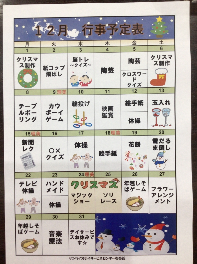 サンライズデイサービスセンター壱番館の12月行事予定表です!!