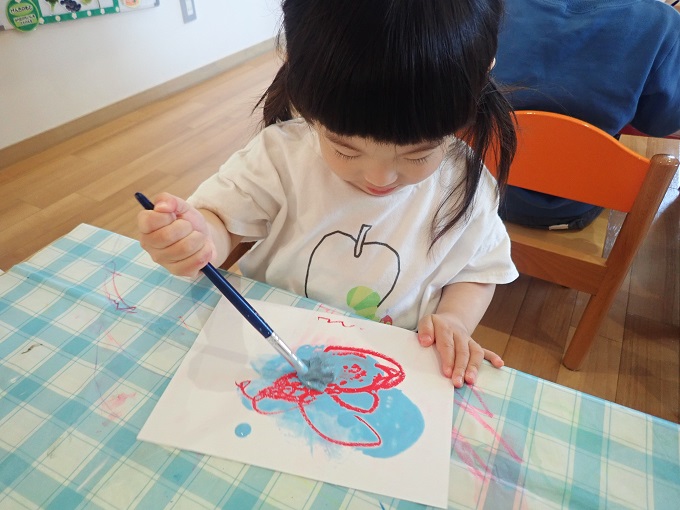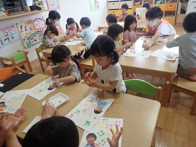 お洋服は、クレヨンでお絵かきをし、絵の具を塗ったはじき絵、お花は、スポンジスタンプを押しました!