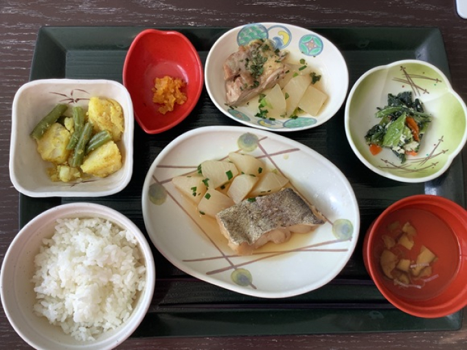白米・タラの煮付け・鶏肉の青じそ風味焼き・じゃが芋カレー炒め・青菜の白和え・すまし汁・漬物
