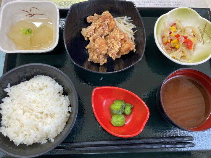 鶏の唐揚げ、冬瓜の煮物、キャベツの和え物、味噌汁、漬け物、御飯 でした