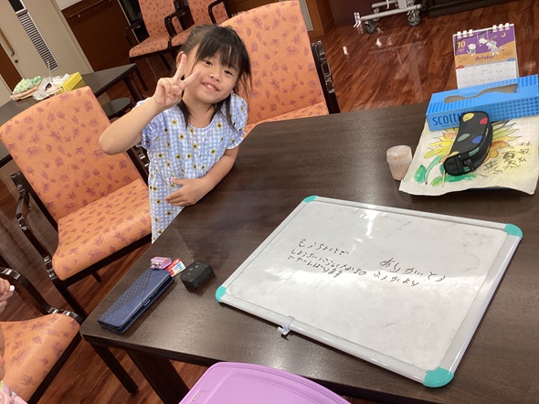 ひ孫様が書かれたホワイトボードの「もうちょっとで しょうがっこうになるので がんばります ありがとう」の文字に利用者様は満面の笑顔で喜ばれていました♪