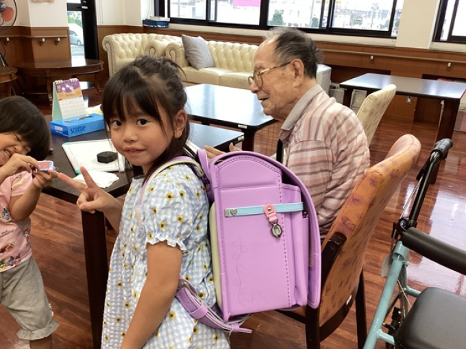 来年小学校へ入学されるひ孫様が利用者様(おじいちゃん)に買っていただいたランドセルを見せに面会に来られました。