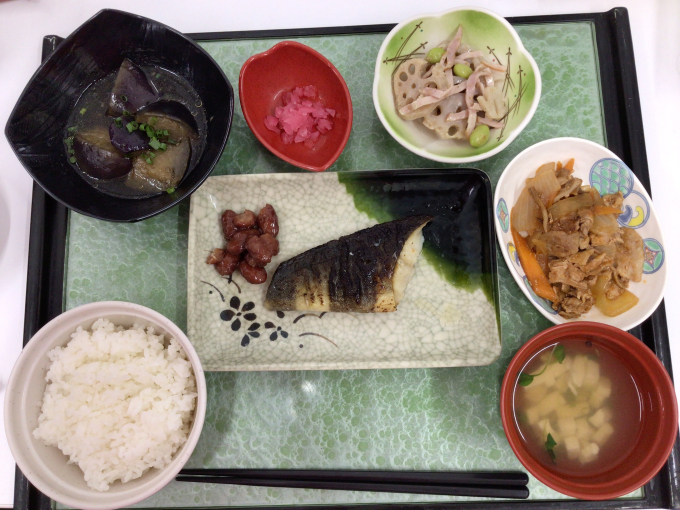 他のメニューは、ご飯、茄子の煮物、蓮根サラダ、すまし汁、漬物です。