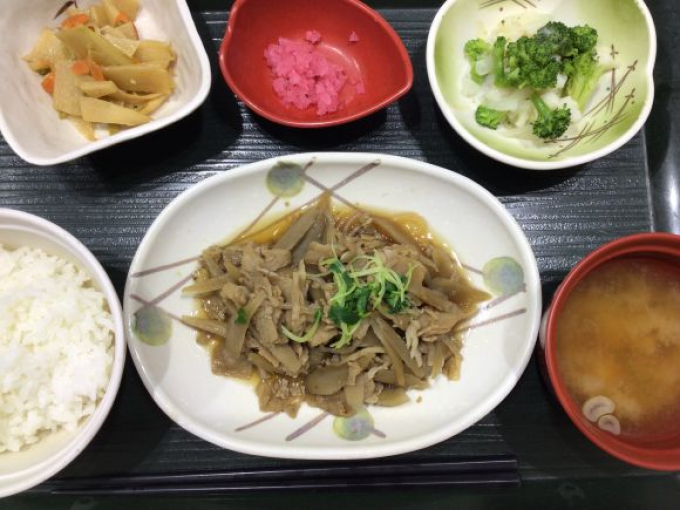 タケノコの炒め物 鼻野菜サラダ 里芋の味噌汁