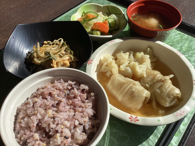 和風のやさしい味わいの『ロールキャベツ』はキャベツがトロッと柔らかく、ジューシーなひき肉の旨味がスープに溶け込んだ一品でした。『にら玉』、『きゅうりと人参のお浅つけ』はあっさりとした味つけで箸休めになるおかずでした。今日も美味しいランチをいただきました。
