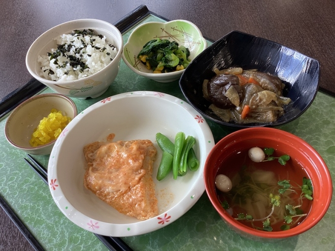 メインは『白身魚の明太マヨ焼き』お魚の上にピリ辛のたらこマヨネーズソースをのせて焼かれた明太マヨ焼きは、パンにもごはんにも合うおかずです。『茄子の味噌炒め』はご飯との相性抜群‼ たんぱくな味わいの茄子に甘辛い味噌味がよく合っていました。出汁の効いたやさしい味わいの『すまし汁』はあっさりと上品な味に仕上がっていました。今日も美味しいランチをいただきました。