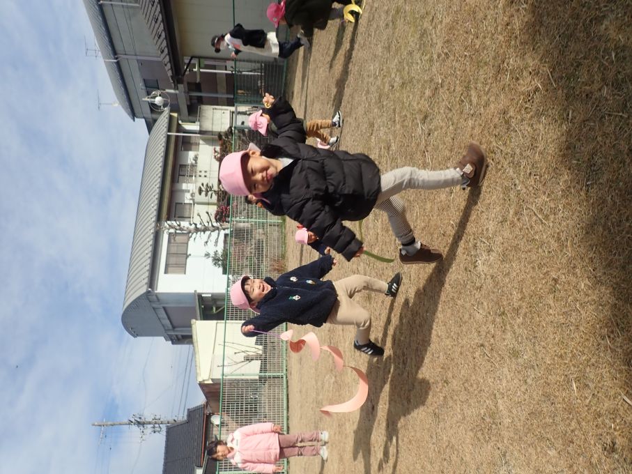 今日もお子さまたちは寒い中、作った凧をあげて元気いっぱいに走っています!