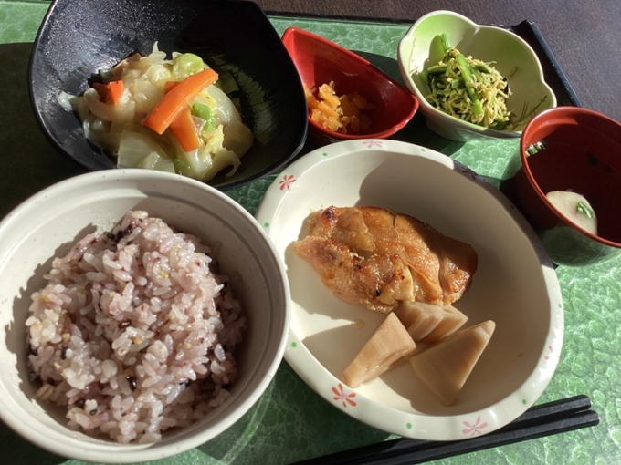 『十五穀米』には白米だけでは不足がちな、ビタミン、ミネラル、食物繊維などの栄養素をバランスよく摂取できる大きなメリットがあるそうです。白米より噛み応えがあるため、咀嚼回数が増え、満腹感がえられました。『鶏肉の西京焼き』は一口食べるとお味噌のやさしい甘みが口いっぱいに広がりました。鶏肉はしっとり、ふわふわ、上品な味わいの一品です。ほうれん草よりカルシウム、鉄分が豊富な栄誉満点の『小松菜の辛子和え』はシャキシャキとした食感に、ピリッと辛いからしがアクセントになっていて箸休めになるおかずでした。