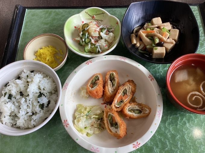 今日のメインは『野菜の肉巻きフライ』です。一口かじるとサクッという小気味よい衣の音が響き、直後に豚肉のジューシーな旨味が溢れだしました。彩り豊かな野菜たちはシャキシャキとした歯ごたえや、人参の甘み、いんげんの香りがお肉の脂をさっぱりと受け止めてくれました。『高野豆腐の煮物』は、一口噛みしめると閉じ込められていた出汁がジュワーと口いっぱいになりました。カリフラワーときゅうりの『カニカマの和え物』はさっぱりとした味付けで箸休めになるおかずです。今日も美味しいランチいただきました。ごちそうさまでした。
