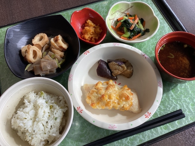 真っ白なご飯に菜っ葉の鮮やかな緑色が映える『菜飯』は素朴で優しい風味が感じられました。『白身魚のマヨコーン焼き』の魚は“パンガシウス”(日本ではバサという名前で販売されています)。淡白でふっくらと柔らかいバサに、コクのあるマヨネーズとコーンがの甘みが重なりとても美味しい一品でした。『蒟蒻の煮物』は甘辛い醤油味の風味が、どこかホッとするお味になっていました。『青梗菜のおひたし』は野菜本来の甘みが感じられ、後味はスッキリでした。今日も美味しいランチをいただきました。ごちそうさまでした。
