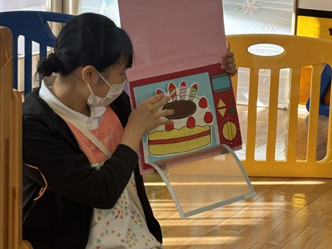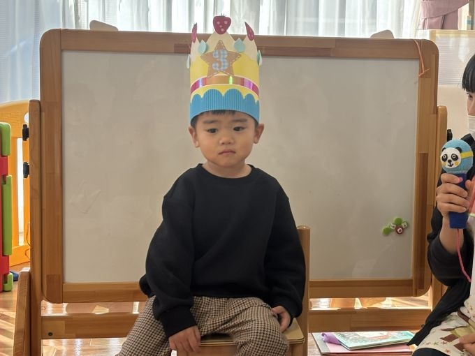 1月生まれのお友だちのお誕生会をしました♪お名前を呼ばれると「はーい」と少し恥ずかしながらも、前のお椅子に座ってくれました☆