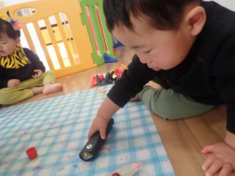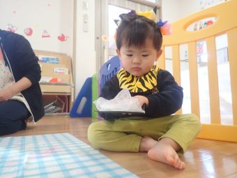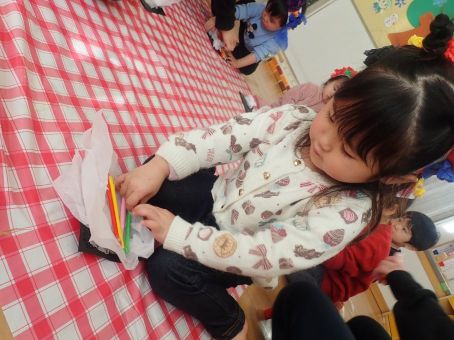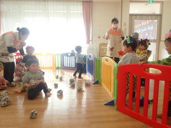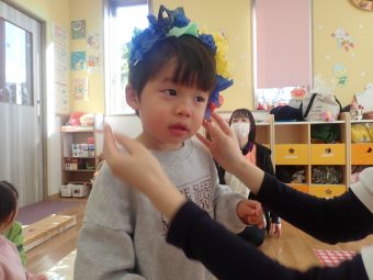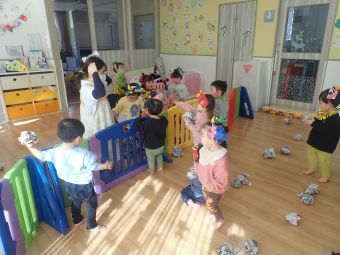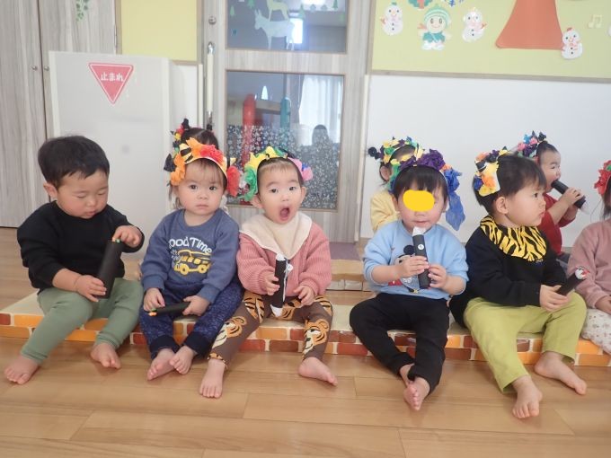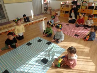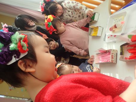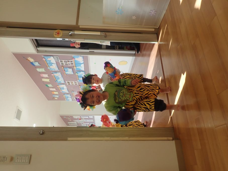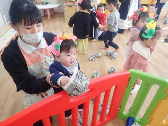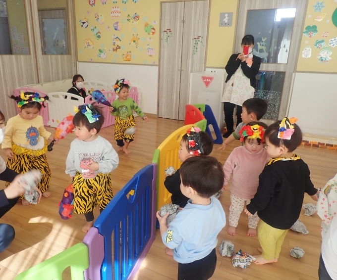 お友だちや保育者と一緒に「おには~そと~ふくは~うち~」と丸めた新聞をなげて豆まきをして楽しみました♪