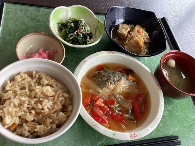 今日は利用者様に大人気の『炊き込みごはん』です。醤油と出汁の香り、旨味のしみ込んだ具材にシャキシャキが感じられます。優しい味わいの、『炊き込みごはん』は、ついおかわりしたくなる逸品です。メインの『鯵の野菜あんかけ』は彩り豊か、赤ピーマン、人参、タマネギと野菜あんがたっぷり。口当たりは非常になめらか、食べごたえ抜群です。『麩のチャンプル』はモチモチ、フワフワのとした食感で毎日食べても飽きのこないおかずでした。今日も美味しいランチいただきました。ごちそうさまでした。