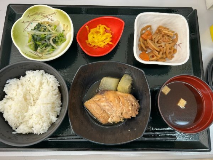 ご飯 鯵の梅煮 蓮根金平 もやしのナムル 味噌汁 漬物でした。