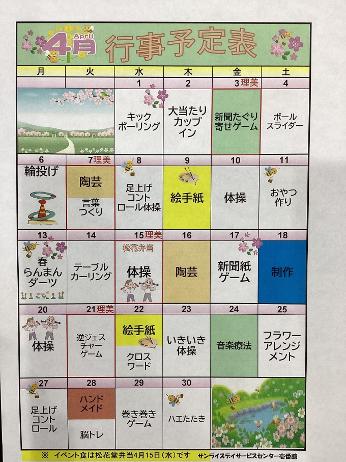 サンライズデイサービスセンター壱番館の4月のレクリエーションの予定表が出来上がりました♪
