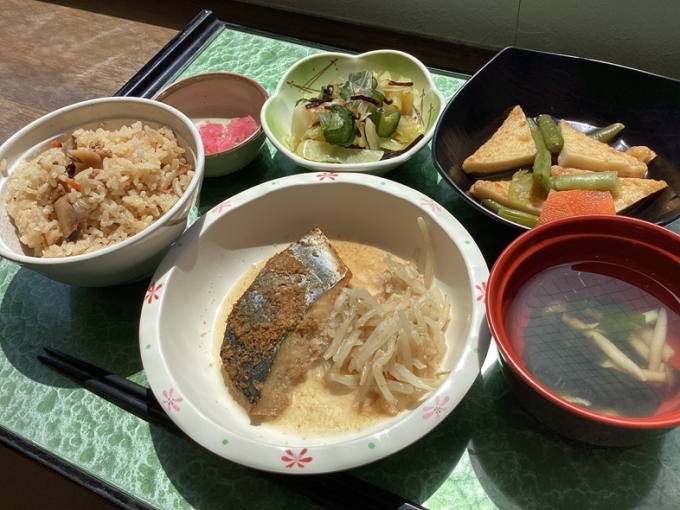 日曜日は混ぜごはんの日 今日は利用者様の中で人気の高い『炊き込みご飯』です。おかずがいらないくらいの、満足感があり、噛むたびに深い味わいが口の中に広がります。『鰆の南部焼き』の鰆の身は、ふっくらと柔らかく、醤油とゴマの香ばしい匂いが、食欲をそそります。『さつま揚げの煮物』見た目に彩りがよく、さつま揚げはプリッとした食感で、どこか懐かしい家庭の味が感じられました。今日も美味しいランチをいただきました。ごちそうさまでした。