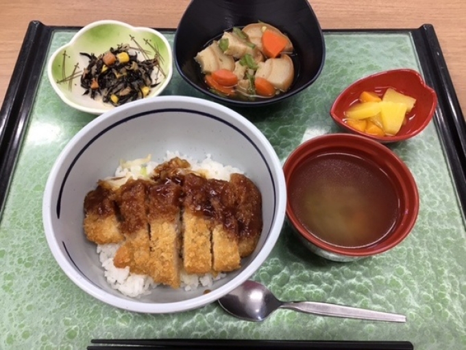 洋風カツ丼・・ご飯の上に茹でたキャベツ、柔らかいソ-スカツ丼です。一口サイズで食べやすいです。