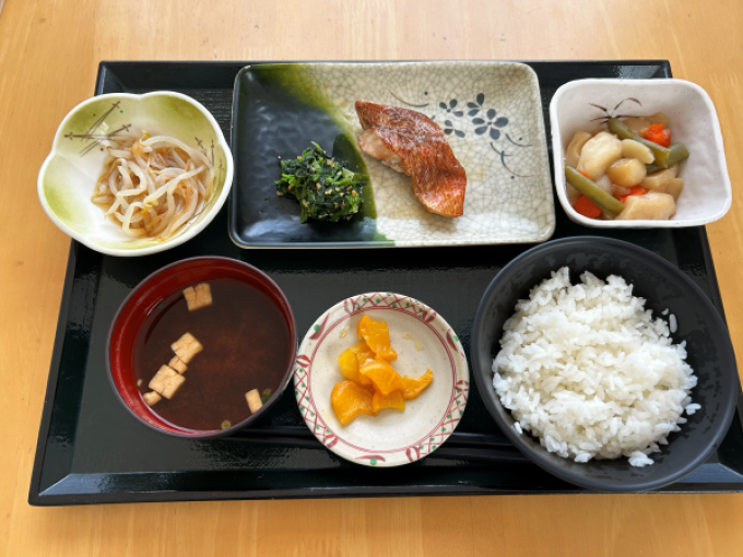 赤魚の山椒焼き、はんぺんの煮物、もやしのなめ茸和え、味噌汁、ご飯、漬け物でした。