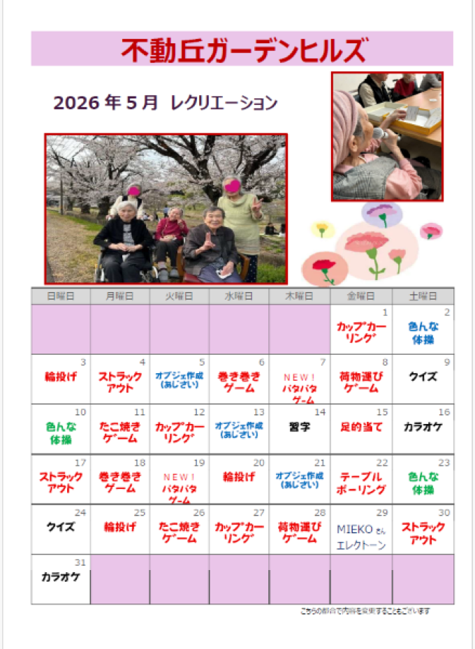 2026年04月25日 5月のレク表 5月は皆さんで、アジサイのオブジェを作成します。どんなオブジェができるか楽しみです 音楽好きには、MIEKOさんの素敵なエレクトーンや、カラオケで皆さんの美声も聞かせていただきます。 « 一覧へ戻る